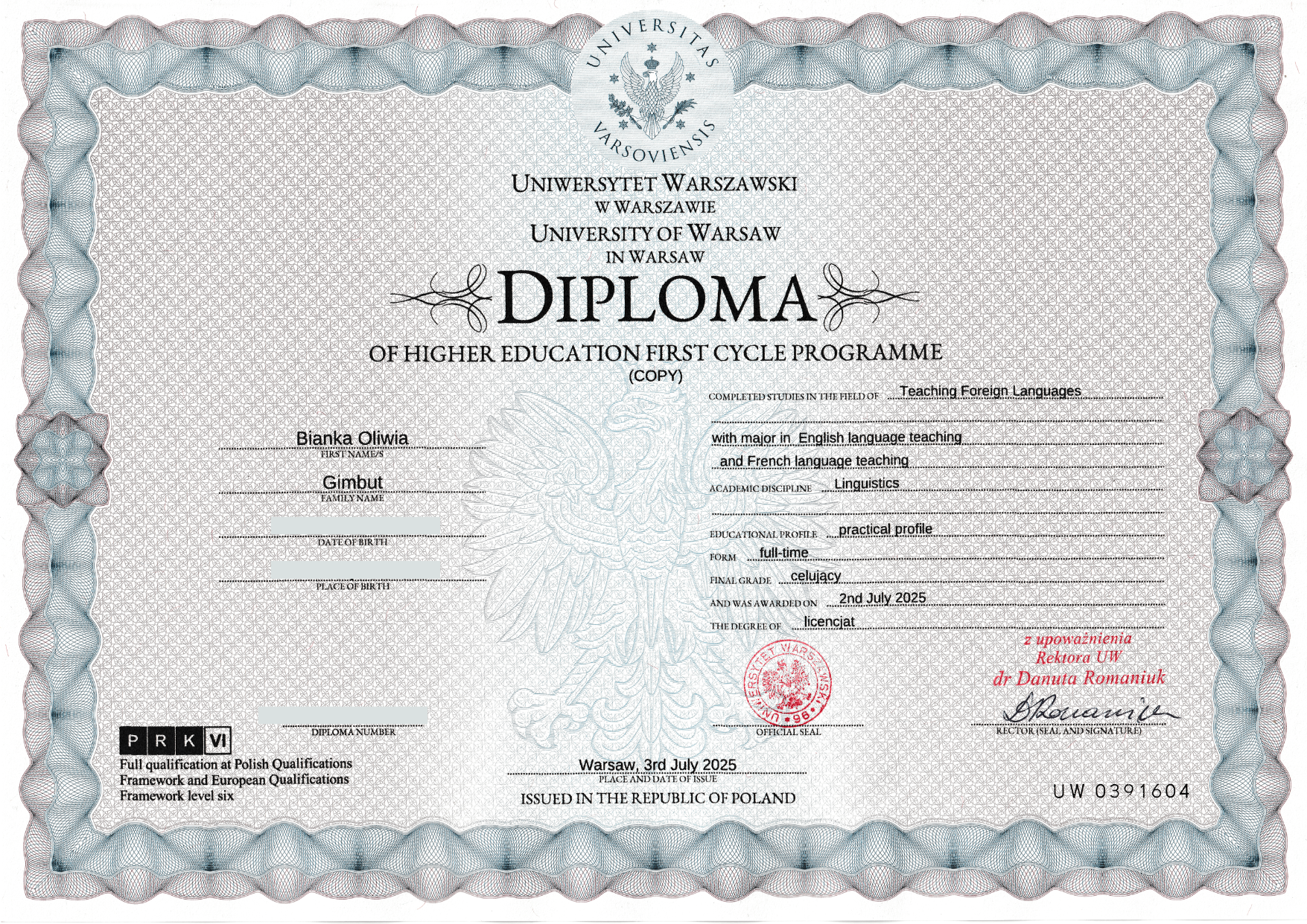 Over the past few years, I’ve taught and completed internships in a wide range of settings – public and language schools, in Poland and France, hybrid, in person and online, with groups, pairs and individuals. These diverse experiences helped me become a flexible, creative and attentive educator.